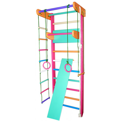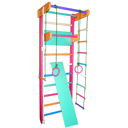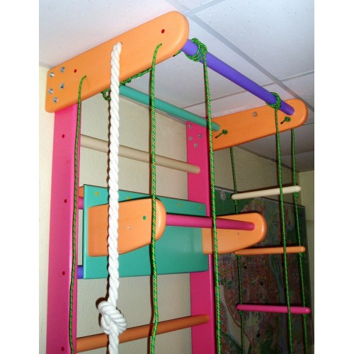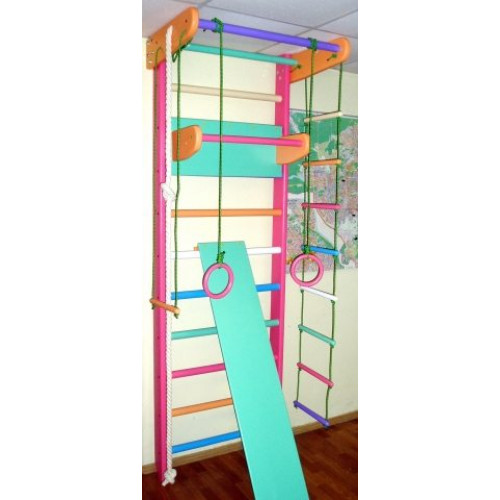 Виріб у вигляді шведської стінки з верхнім турніком, мотузковим набором (кільця, канат, трапеція, мотузкова драбинка), навісним дитячим турніком (або навісним турніком-брусами 2 в 1 або навісними брусами), дошкою-гіркою (або дошкою для спини та преса) .
