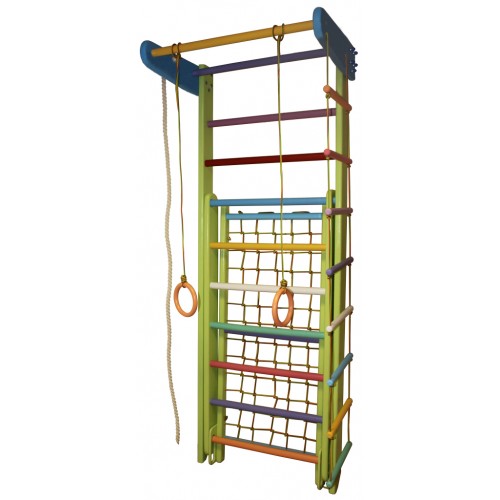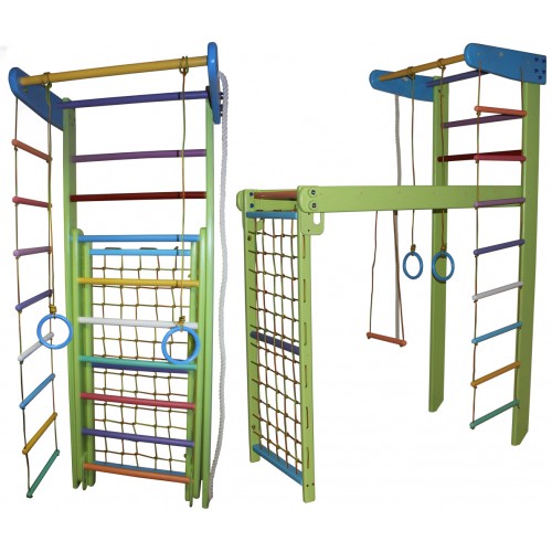 Спортивний куточок-трансформер використовується в двох положеннях: в складеному вигляді він являє собою стандартну шведську стінку, а розкладаюча нижня частина перетворює його в комплекс з рукоходом і гладіаторською сіткою для лазання. Процес збирання та розбирання гранично простий і займає не більше 1 хвилини. Цей спортивний куточок є оптимальним рішенням, як найбільш функціональний і компактний.