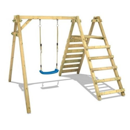 Виріб з підвісною гойдалкою з пластику без спинки. Канат на металевих кільцях і регулюється по висоті. З двосторонньою драбиною. Гойдалку пофарбувати можна в різні кольори на вибір.