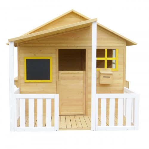 Виріб у вигляді дитячого будиночка. З дахом і огорожею білого кольору.
