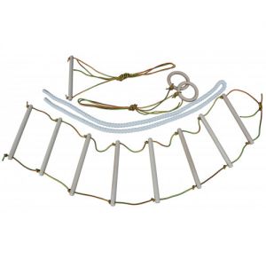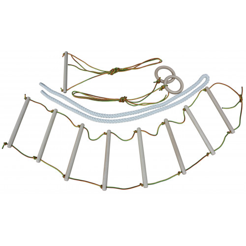 | Матеріал | перекладини мотузкової драбинки і трапеції - бук; кільця виточені з міцної водостійкої фанери; мотузка в елементах мотузкового набору - поліпропілен; канат (діаметр 22мм) - бавовна |