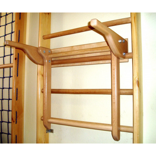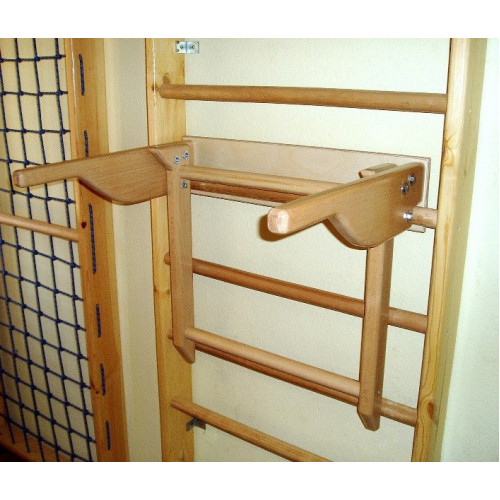 Навісні гімнастичні бруси - прекрасне доповнення шведській стінці, П-образним комлексу. Турнік легко переважити на будь-яку з перекладин шведської стінки. Турнік підходить дітям, не дивлячись на їх фізичну підготовку. За допомогою цього доповнення, можливо збільшити кількість вправ і навантажень для фізичного розвитку дитини. Призначається при лікуванні, яке включає інші види реабілітаційних процедур. Використовується для тренування в спортзалах, лікування і реабілітації в кабінетах лікувальної фізкультури, а також в домашніх умовах. Покритий водорозчинних лаком, схвалений Міністерством охорони здоров'я України та мають наступні переваги: не має запаху; екологічно чиста водорозчинна композиція акрилових; латексів з стабілізуючими; стійкий до вологи, воді та миття побутовими хімікатами; витримує покриття органорозчинуючі лаків; плівка стійка до УФ-випромінювання; захищає деревину від біологічного руйнування; рівномірно стійкий до механічного стирання; через час не міняє колір плівки і поверхню деревини.