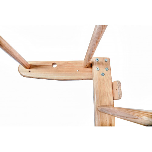 | Матеріал | боковини: шведська стінка і турнік - ясен перекладини: шведська стінка - ясен кільця виточені з міцної водостійкої фанери, 21 мм мотузка в елементах мотузкового набору - поліпропілен канат - бавовна, 22 мм Дошка комбінована ребриста для преса і спини - 15 |