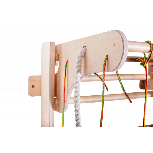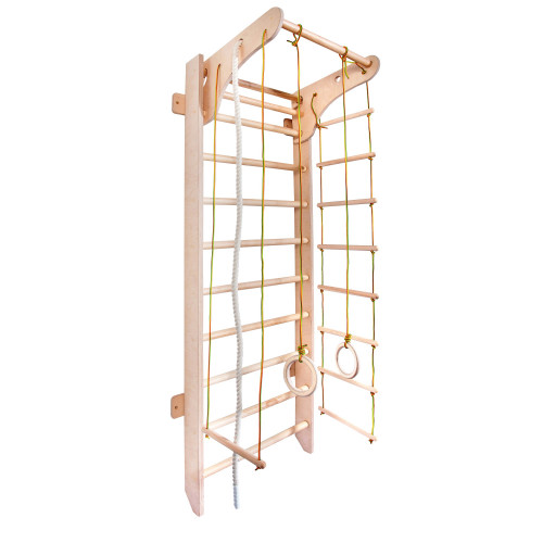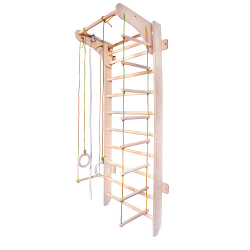 Шведська стінка з посиленим навісним турніком і мотузковим набором виконує функцію зміцнення всіх груп м'язів, вдосконалення локомо акту ходьби, розвитку вестибулярного апарату в процесі виконання фізичних вправ. Для активних дітей. Призначається при лікуванні, яке включає інші види реабілітаційних процедур. Шведська стінка використовується для тренування в спортзалах, лікування і реабілітації в кабінетах лікувальної фізкультури, а також в домашніх умовах. Дитячий комплекс покритий водорозчинних лаком, схвалений Міністерством охорони здоров'я України та мають наступні переваги: не має запаху; екологічно чиста водорозчинна композиція акрилових; латексів з стабілізуючими; стійкий до вологи, воді та миття побутовими хімікатами; витримує покриття органорозчинуючі лаків; плівка стійка до УФ-випромінювання; захищає деревину від біологічного руйнування; рівномірно стійкий до механічного стирання; через час не міняє колір плівки і поверхню деревини.