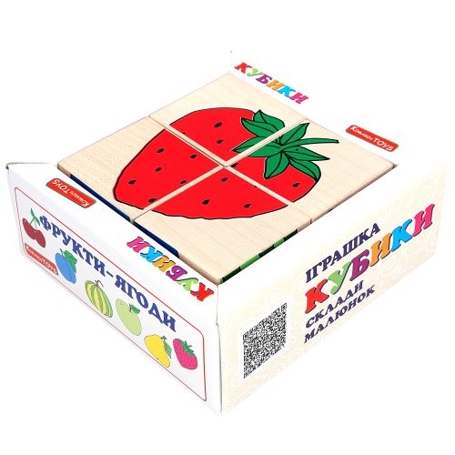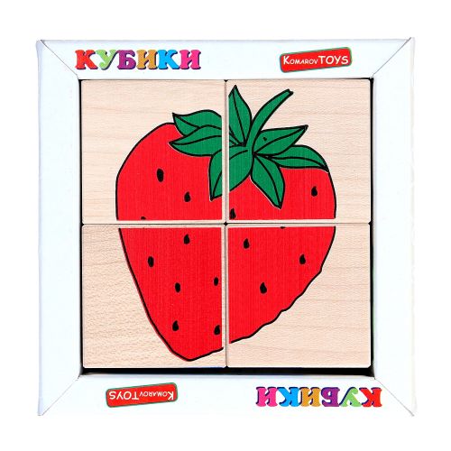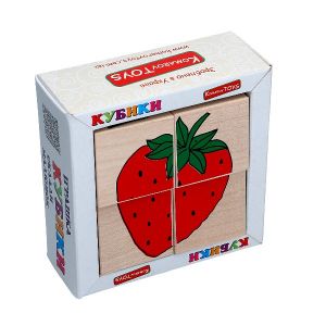 4 кубиків розміру 4 х 4 см. Виготовлені з дерева, добре відшліфовані, легкі, малюнок нанесений за допомогою шовкографії, завдяки чому іграшка є дуже зносостійкою і вічною. Набір підійде для дітей до 6 років, для домашніх ігор та дошкільних закладів.