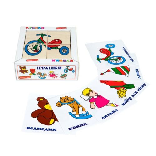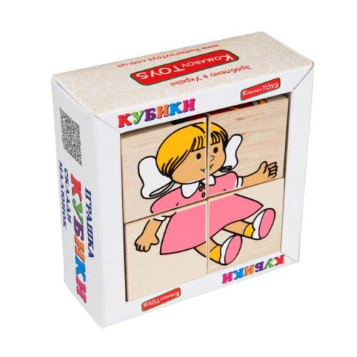 4 кубиків розміру 4 х 4 см. Виготовлені з дерева, добре відшліфовані, легкі, малюнок нанесений за допомогою шовкографії, завдяки чому іграшка є дуже зносостійкою і вічною. Набір підійде для дітей до 6 років, для домашніх ігор та дошкільних закладів.