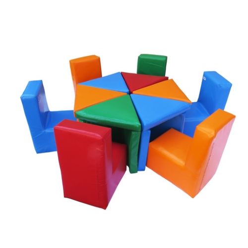 Багатофункціональний, яскравий м'яко модульний інтер'єрний набір, який складається з 12 модулів (6 стільчиків, 6 столиків). Призначений для ігор дітей у кількості 6 осіб, з модулями можна грати окремо або в зібраному вигляді, розставляти столи і стільці в будь-якій послідовності. За бажанням замовника набір може бути виготовлений з аплікаціями.