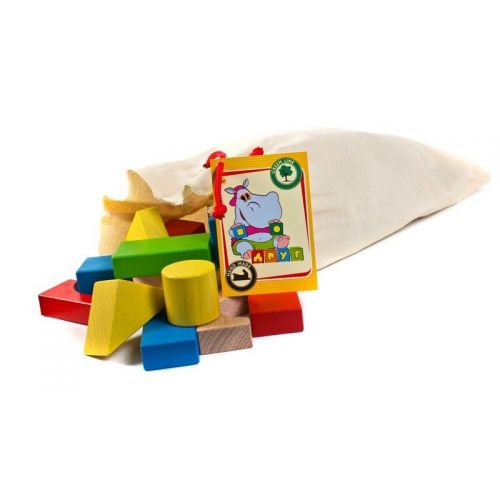 Якісний дерев'яний конструктор, що складається з 44 комбінованих деталей, упакованих у великий полотняний мішок з міцними зав'язками, в який зручно складати елементи після гри.
