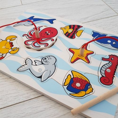 Виріб у вигляді набору з основи і 9 елементів-пазлів з малюнками морських тварин. З 2 вудками. Гра розвиває дрібну моторику, увагу, логіку, уяву, творчість.