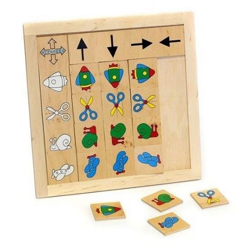 Виріб у вигляді набору з основи-планшета і 18 елементів з різними малюнками. На лівій стороні планшета по вертикалі зображені контури зображень, а по горизонталі зазначено напрям: вгору, вниз, вправо, вліво. Гра розвиває дрібну моторику, увагу, логіку, уяву, творчість.