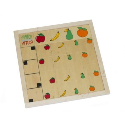 Виріб у вигляді набору з основи-планшета і 18 елементів з різними малюнками. На лівій стороні по вертикалі зображено місце розташування предмета (правий верхній кут, лівий верхній, нижній правий, нижній лівий), а по горизонталі вказані фрукти. Гра розвиває дрібну моторику, увагу, логіку, уяву, творчість.