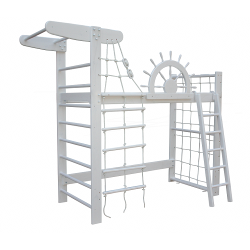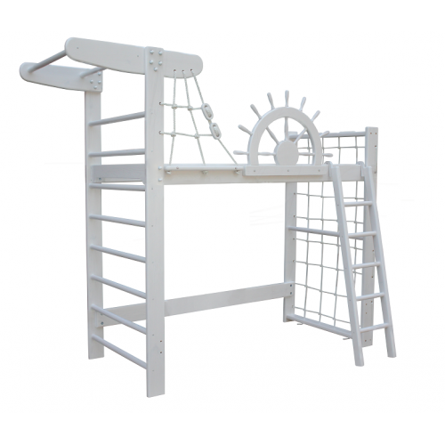 Виріб у вигляді ліжка і спортивного комплексу одночасно. Спальне місце розміром 190х80 см, захисний бортик-штурвал, захисна сітка, шведська стінка з турніком, гладіаторська сітка. Розмір ліжка 250х94 см. Висота шведської стінки 210 см, гладіаторської сітки 160 см. Ширина драбинки 40 см.