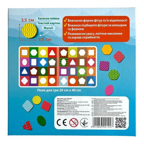 Магнітні пазли для розвитку моторики та інтелекту. В комплекті 32 геометричні фігури (3,5 х 3,5 см), які допомагають вивчати форми та кольори. Поле для гри - 20 х 40 см. Якісні матеріали: товстий картон, магніти, захисна плівка.