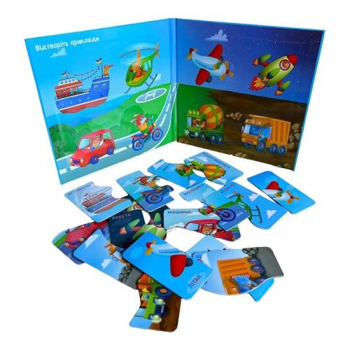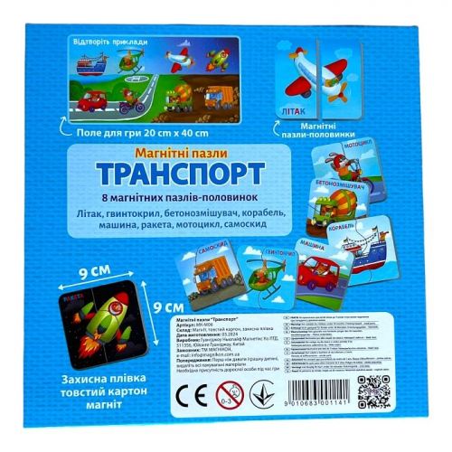 - 8 магнітних пазлів-половинок "Транспорт": Літак, Гвинтокрил, Бетонозмішувач, Корабель, Машина, Ракета, Мотоцикл, Самоскид.