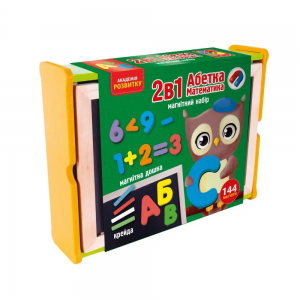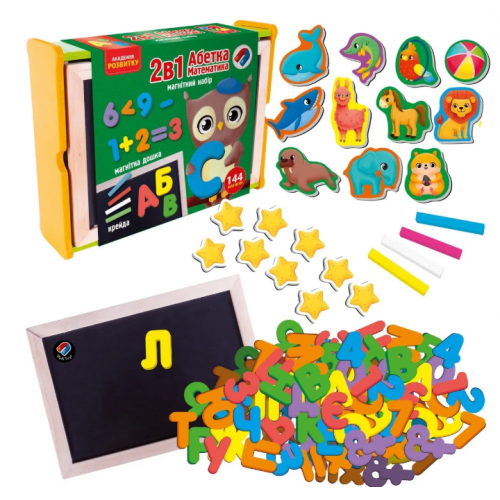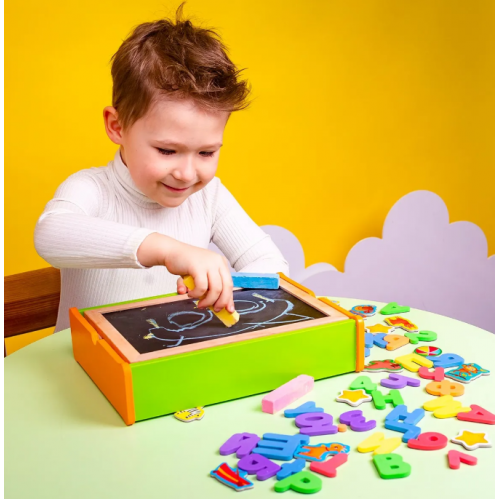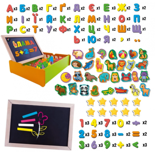 Магнітний набір у дерев’яній коробочці – все для веселого й корисного навчання вдома! Двостороння дошка, магнітні літери, цифри, знаки й тваринки, а також кольорова крейда – усе, щоб вивчати абетку, математику, створювати малюнки та тренувати дрібну моторику. Натуральні матеріали, зручний дизайн і 144 магніти для розвитку мовлення, логіки та уяви вашої дитини. Ідеально для дітей 4-7 років!