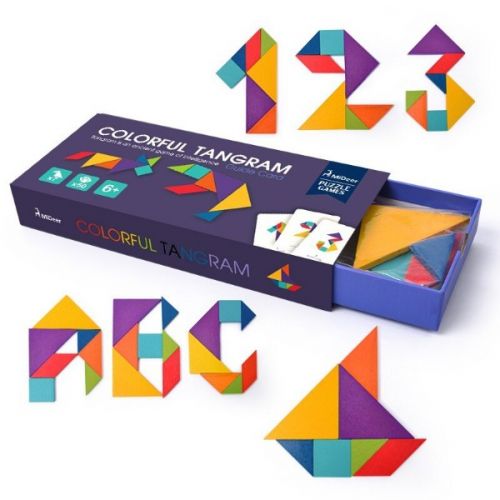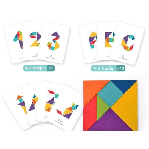 Виріб у вигляді яскравого набору з 7 різних плоских фігур, 50 двосторонніх карток із завданнями. Гра для розвитку дрібної моторики, логіки, уваги, фантазії.