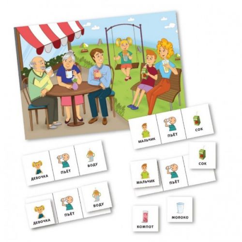 Виріб у вигляді набору з 126 барвистих карток з малюнками для побудови більш 36 різних фраз, вивчення значення різних слів, розвитку логопедії у дітей.