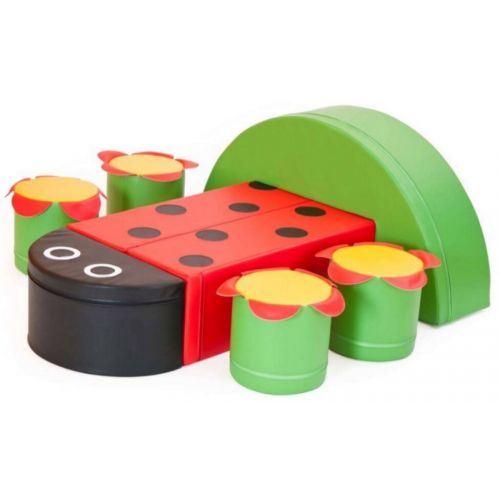 Виріб у вигляді яскравого набору з 7 м'яких модулів у формі сонечка (столика, 4 стільчиків, 2 напівкіл). З аплікацією, блискавкою, липучками.