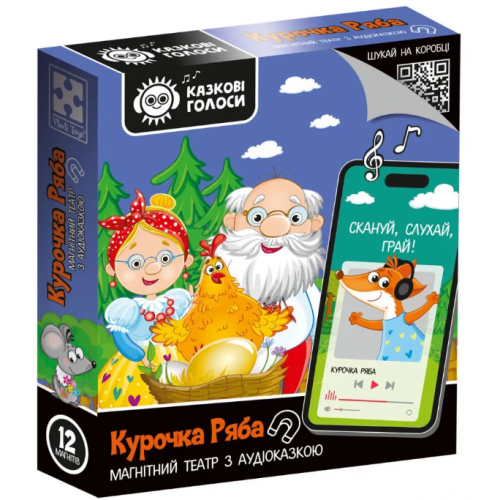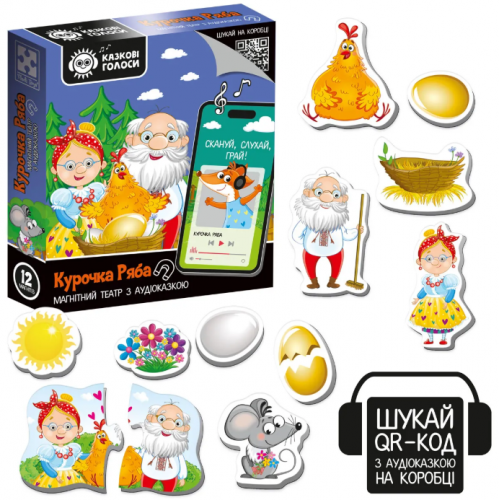 Театр і казка в одній коробці! Серія "Казкові голоси" — це магнітний театр з аудіоказкою для малюків від 3 до 6 років. У комплекті 15 яскравих магнітів і поле для гри, де дитина зможе створювати казкові вистави. Відкрийте коробку, відскануйте QR-код, і слухайте аудіоказку разом з малюком, розігруючи сцени на магнітному полі. Ідеальний спосіб поєднати слухові та творчі навички!