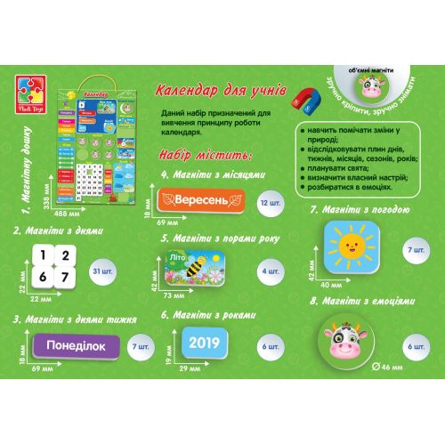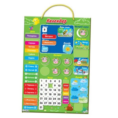 Календар дозволить вивчити такі поняття як час, дата, день тиждня, місяць, рік, пора року, погода. Яскраві кольори та цікаві деталі привернуть увагу дитини.