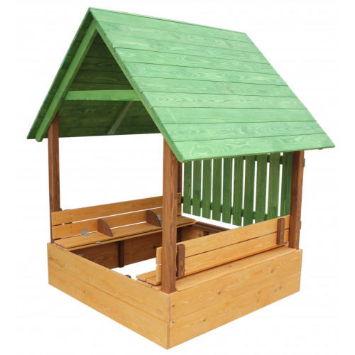 Пісочниця-будиночок з лавочками, дахом і захисним парканом
