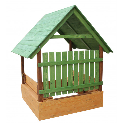 Виріб у вигляді пісочниці-будиночка з двосхилим дахом, зручними лавками, захисним парканом.