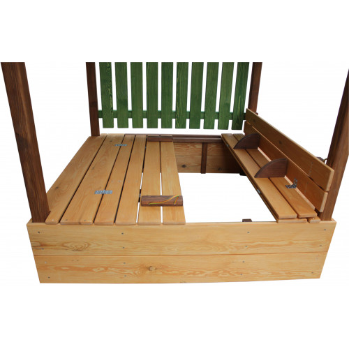 Пісочниця-будиночок з лавочками, дахом і захисним парканом виготовлена з якісного та натурального дерева сосни. Матеріал безпечний для дітей. З обробленими деталями без шорсткостей.