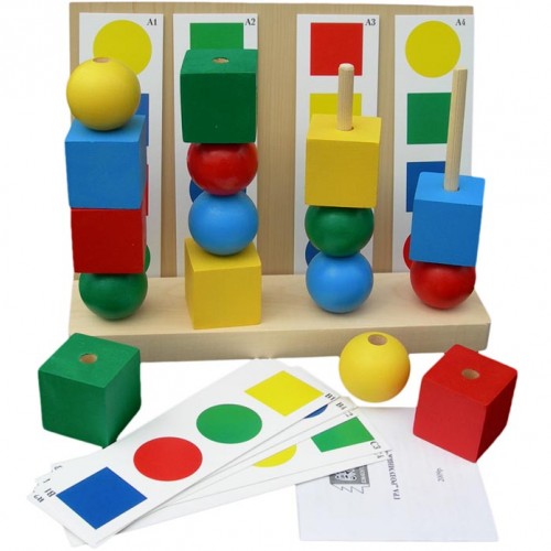На дерев'яній основі закріплено чотири стержні. На бічну поверхню виставляються картинки із завданнями. Кульки і кубики потрібно виставити строго за кольорами і формами згідно із завданням. Картки можна міняти місцями і перевертати на 180 градусів. Задня вертикальна стінка знімна. Тому гру можна складати і як звичайні пірамідки, за кольорами, формами, по діагоналі і врозкид.