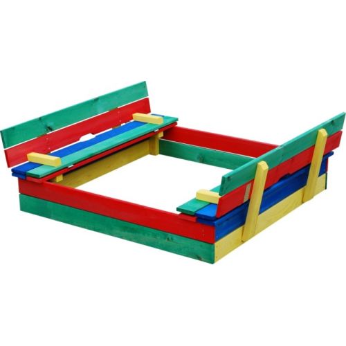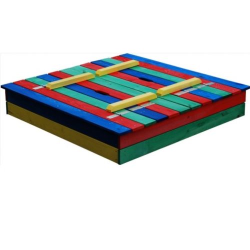 Універсальна дерев'яна пісочниця - кольорова та цікава. Завдяки компактності може бути чудовим ігровим місцем не лише для дитячих садків, але й для маленьких ігрових майданчиків. Пісочниця обладнана двома лавочками зі спинками, які легко трансформувати у кришку, що дозволяє захистити пісок від вологи та сміття