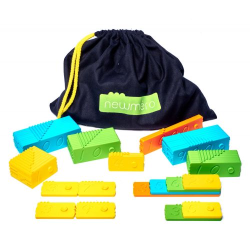 Newmero - це пластини з вибитим числовим значенням, з зубчиками та кнопками що з'єднуються. Варіанти складання: одна до одної, суміжне розташування, верхівка до верхівки, спинка до спинки, одна на одну. Кожен варіант складання наочно показує чи досягнута сума 10, 100 або 1000 за співпадінням, шпаринками та накладанням зубчиків.