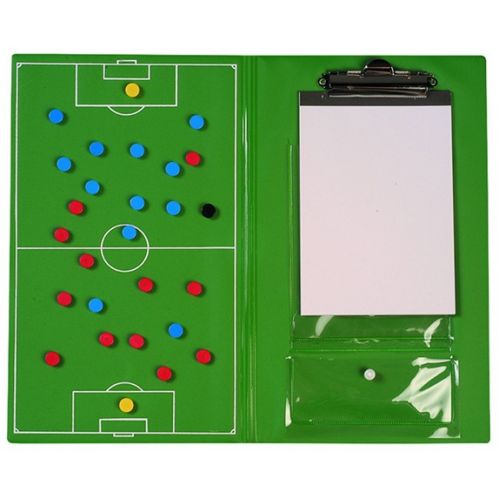 Це зручний аксесуар для футбольного тренера. З його допомогою можна розробляти тактику і стратегію гри. Склад: магнітна поверхня зеленого кольору з нанесеною на ній розміткою, яка імітує футбольне поле. Поверхня призначена для кріплення до неї різнокольорових фішок, які імітують гравців на полі. У комплекті: фішки різних кольорів. Збоку є затиск для паперів і для маркера, пластикова кишеня для фішок.