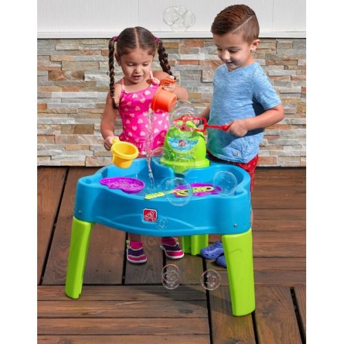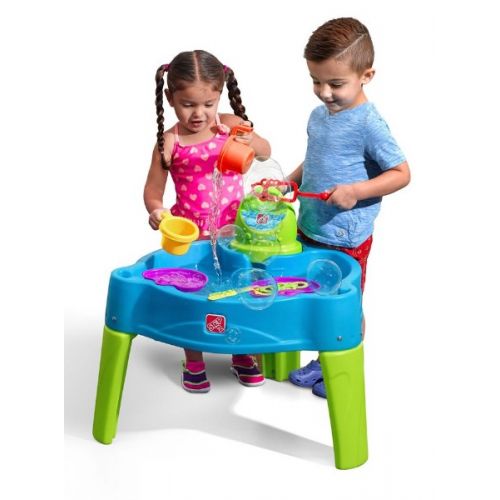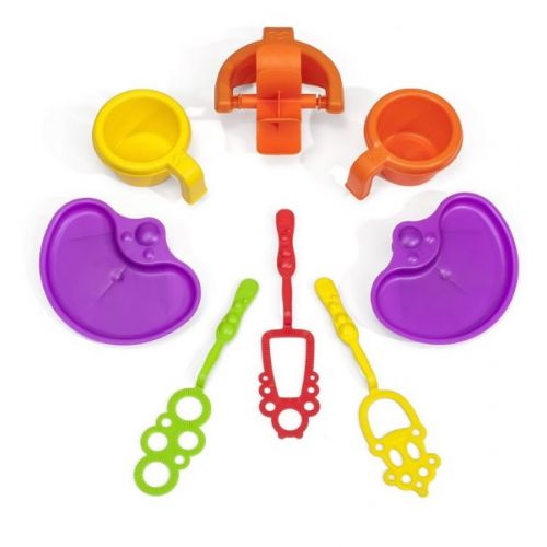 Виріб у вигляді столика. З 2 зонами синього і жовтого кольору для води і піску. Басейн синій для води, з обертаючими вертушкою і млином. Пісочниця жовта для будівництва конструкцій з піску. У наборі 3 формочки, склянка, парасолька.