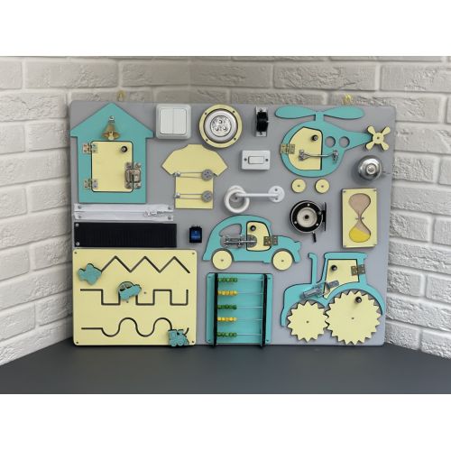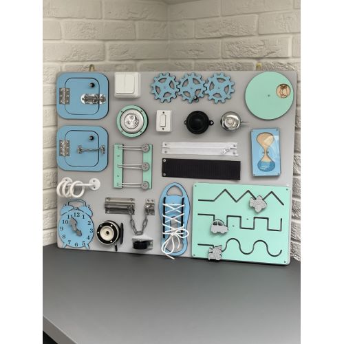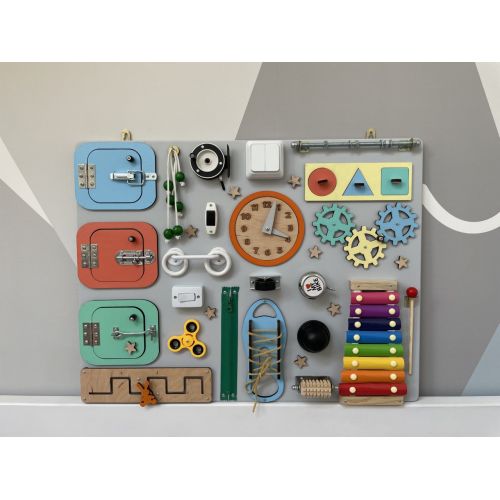 БизиБорд 65х50 замечательная развивающая игрушка по методике Марии Монтессори. 40 развивающих элементов сделают игру увлекательной и познавательной. Во время игры активно развивается мелкая моторика, координация движений, логика, а также внимательность.