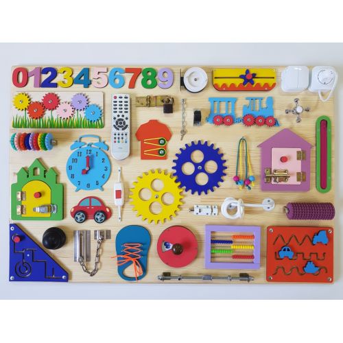 Бизиборд - развивающая доска для ребенка, состоит из различных предметов, которые могут заинтересовать ребенка дома. Данная доска поможет Вашему ребенку в развитии мышления, логики, изобретательности, мелкой моторики по системе Монтессори. Для изготовления всех бизибордов используется только натуральная древесина. Все наполнение на доске надежно закреплено с помощью саморезов или клея. Основа - дерево, наполнение - дерево, пластмасса, металл.