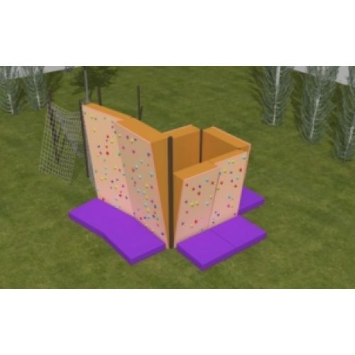 Изделие в виде спортивного скалодрома (альпинистской стенки). С литыми экологическими зацепами, матами, металлическими элементами, порошковым напылением материала для развития физических навыков.