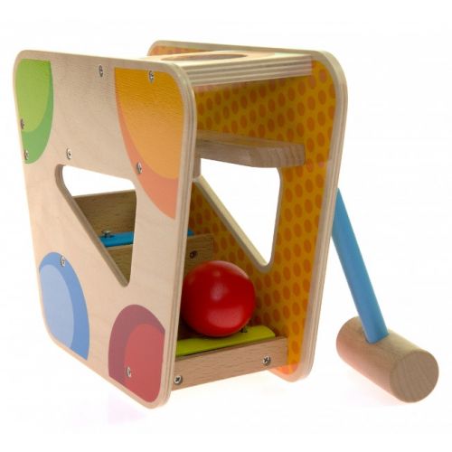 Детский деревянный сортер с ксилофоном немецкого производителя игрушек goki - это настоящая музыкальная находка для самых маленьких. Устройство состоит из яркой деревянной формы, молоточка и красного шара. Чтобы услышать мелодию ксилофона, необходимо положить шар в отверстие сверху и, приложив усилия, стукнуть по ней молоточком. После этого шар упадет в желоб, скатится и пройдется музыкальной лестницей сортера.