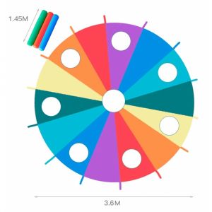 Парашют - это яркая ткань, которая делится на секторы с отверстиями. По кругу расположены ручки. Подходит для игр в спортивном зале и на улице. Игра с парашютом научит детей коммуницировать и договариватся. Дети смогут почуствовать себя частью команды.