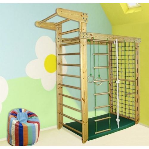 При производстве спортивного комплекса используется массив сосны высокого качества, все детали тщательно обработаны и покрыты несколькими слоями безопасного лака без запаха, что увеличивает срок службы спорткомплекса, все видимые винты закрыты заглушками. Применение буковых перекладин позволяет выдерживать нагрузку до 120 кг