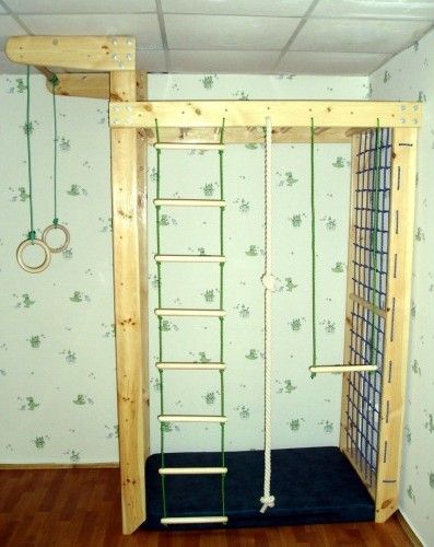Крепится спортивный комплекс с рукоходом боковой поверхностью всего комплекса к стене, а выступающие части крепятся в пол.