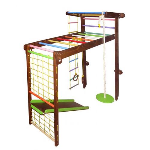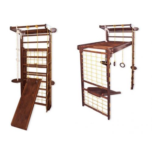 В комплекте: шведская стенка, турник, пиратская сетка, рукоход, веревочный набор, детская горка, крепеж.