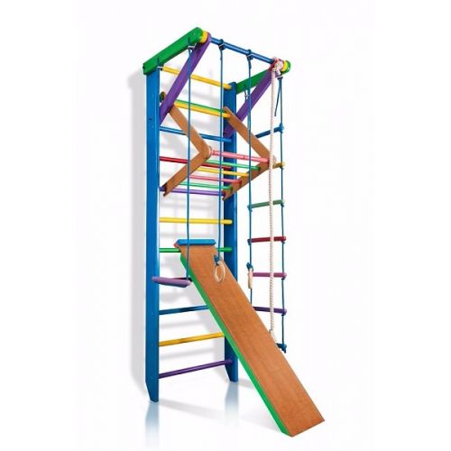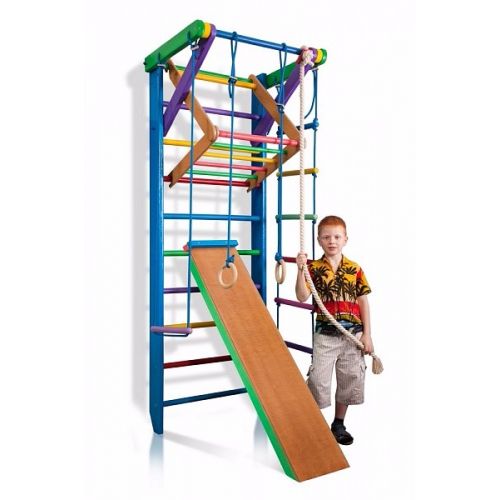 Спортивный уголок «Радуга 3» - это многофункциональный спорткомплекс, который станет прекрасным дополнением детской комнаты, а наличие съёмного турника и дополнительного упора на основном турнике позволит тренироваться на нем всем членам семьи. Комплекс позволяет выполнять укрепляющие и развивающие упражнения в игровой форме в домашних условиях, благодаря чему выработается отличная осанка, окрепнут мышцы рук, ног, спины и пресса.