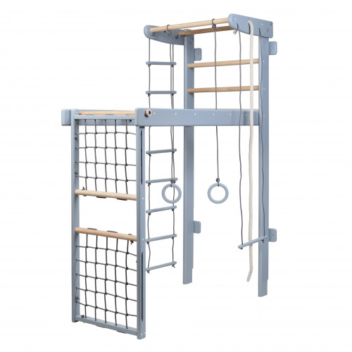 | Материал | боковины: шведская стенка, рукоход, гладиаторская сетка, турник - сосна перекладины: шведская стенка, рукоход, турники, веревочная лесенка и трапеция - ясень/бук кольца выточены из прочной водостойкой фанеры веревка в элементах веревочного набора и сетки |