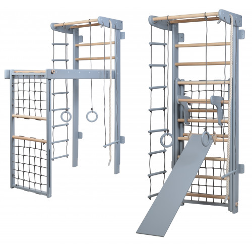 Спортивный уголок-трансформер Grey Полный комплект с детским турником и доской выполняет функцию укрепления всех групп мышц, совершенствование локомоторного акта ходьбы, развития вестибулярного аппарата в процессе выполнения физических упражнений. Для активных детей. Назначается при лечении, которое включает другие виды реабилитационных процедур. Шведская стенка используется для тренировки в спортзалах, лечения и реабилитации в кабинетах лечебной физкультуры, а также в домашних условиях. Детский комплекс покрыт водорастворимым лаком, одобрен Минздравом Украины и имеют следующие преимущества: не имеет запаха; экологически чистая водорастворимая композиция акриловых; латексов со стабилизирующими добавками; стойкий к влаге, воде и мытью бытовыми химикатами; выдерживает покрытие органорастворимых лаков; пленка стойка к УФ-излучению; защищает древесину от биологического разрушения; равномерно стойкий к механическому истиранию; через время не меняет цвет пленки и поверхность древесины.