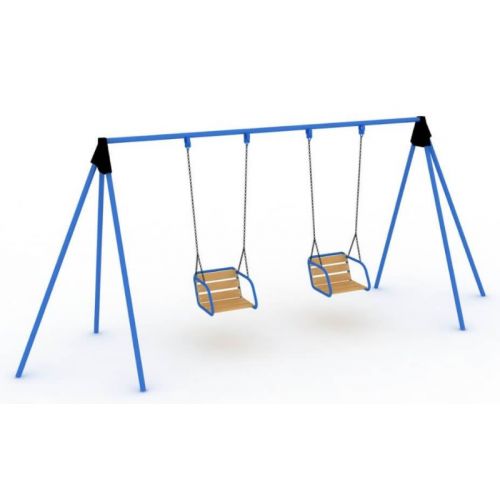 Изделие в виде уличной двухместной удобной и прочной качели с опорами. Сиденье с ручками и спинкой. Для детей от 3 лет.