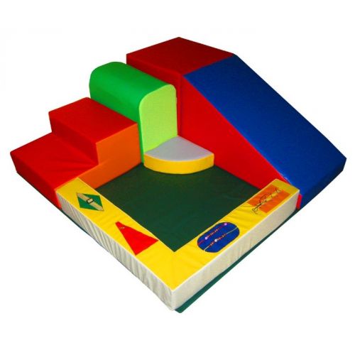 Изделие в виде яркого разноцветного мягкого модуля из 7 отдельных элементов: куба, ступеньки, бортика, горки, сектора, бруса, полотна. Размер куба 50х50х50 см, ступеньки 60х50х30 см, углового бортика 90х90х15 см, горки 90х50х40 см, сектора 30х10 см, бруса 50х30х45 см, полотна 140х140 см.