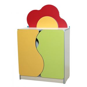Материал: корпус, полки, дверцы - ДСП ламинированная, толщина 16 мм. Задняя стенка: ДВП ламинированная белая 3 мм. Фасад оклеен кромочной лентой ПВХ - 1 мм; другие части ПВХ - 0,5 мм. Имеет фигурные вырезы и элементы. Цвет: крем, желтый, красный, лайм.