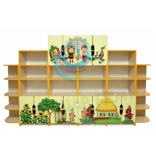 Материал: ламинированная ДСП (16 мм), оклейка ПВХ (1 мм). Используется в детских садах и младшей школе для хранения книг, папок, детских вещей или разного дидактического материала. Состоит из разных отдельных элементов.