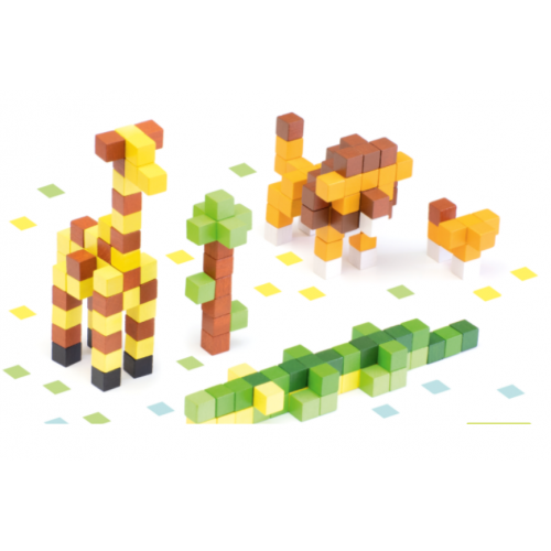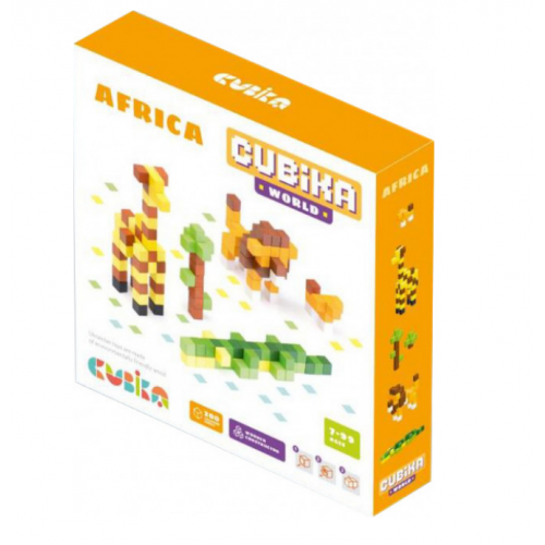 Состоит из ярких кубиков разного цвета из которых можно составлять объемные фигуры. Крепятся они с помощью двустороннего скотча. В комплекте есть образцы по которым можно составлять или придумывать свои сюжеты. Тематика: Африка.