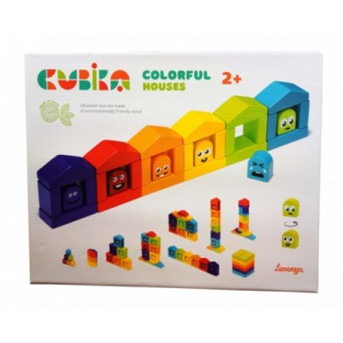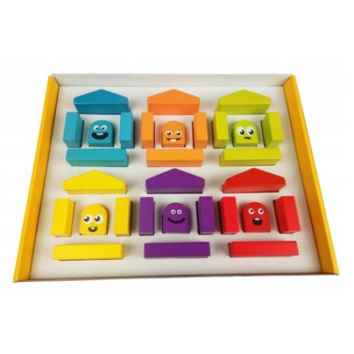Изделие в виде яркого разноцветного набора из разных элементов для построения домиков с лицами.
