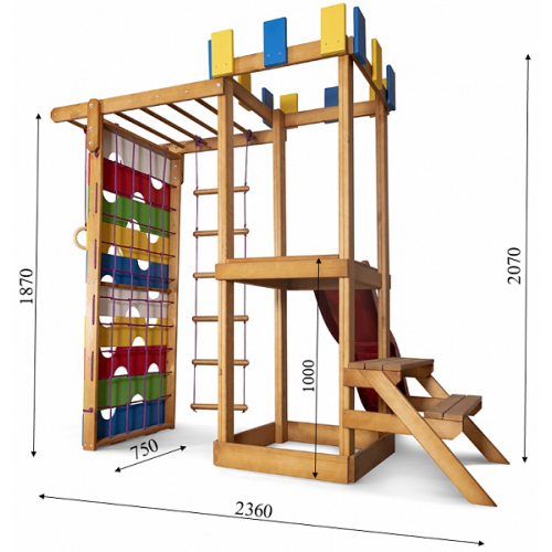 Детский игровой комплекс сделан из натурального дерева. Покрыт антисептиком и тонировкой, для продления службы комплекса. Компактная. Двускатная крыша защитит от солнца или дождя, обеспечив комфортную игру и отдых. Горка имеет боковые бортики, для дополнительной безопасности. Сделана из пластика высокой плотности. Устойчива к растрескиванию и солнечным лучам, неблагоприятным погодным условиям. На площадке сможет играть компания детей. Это поможет развить социальные навыки, терпения, взаимопомощи. Подойдет для двора или детского сада. Благодаря детскому комплексу, игры и физические упражнения можно проводить на улице.